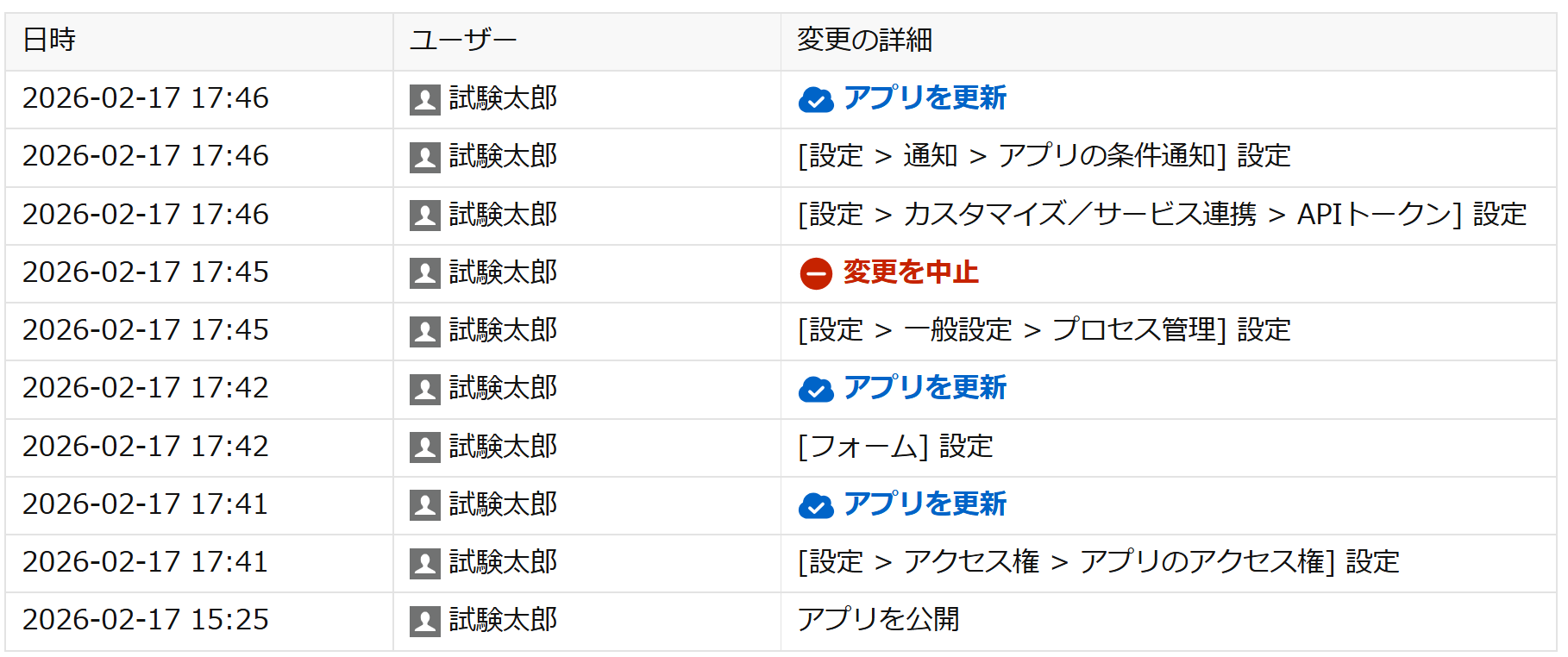 いつ、誰が、どのような変更を行ったのか表示されています。